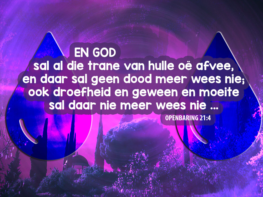 Ja, daar in die hemele sal God ons laaste traan afvee, en daarna sal ons nie meer trane ken nie. Ons sal nie meer die vloek oor die sonde, die dood, ken nie. Ons sal nie meer met moeite werk nie. En, ons sal nie meer in die sweet van ons aangesig eet nie. Nog meer, dan is ons ewig by die Here!