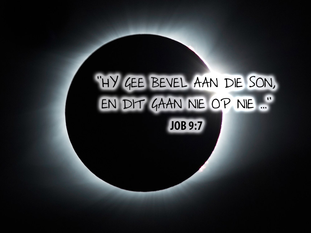Wanneer ons kyk na tekste soos Job 9:7 en Job 38:12-15, sien ons ’n God wat nie net die heelal gemaak het nie, maar dit aktief regeer—tot op die punt waar Hy die son kan beveel om op te hou skyn.