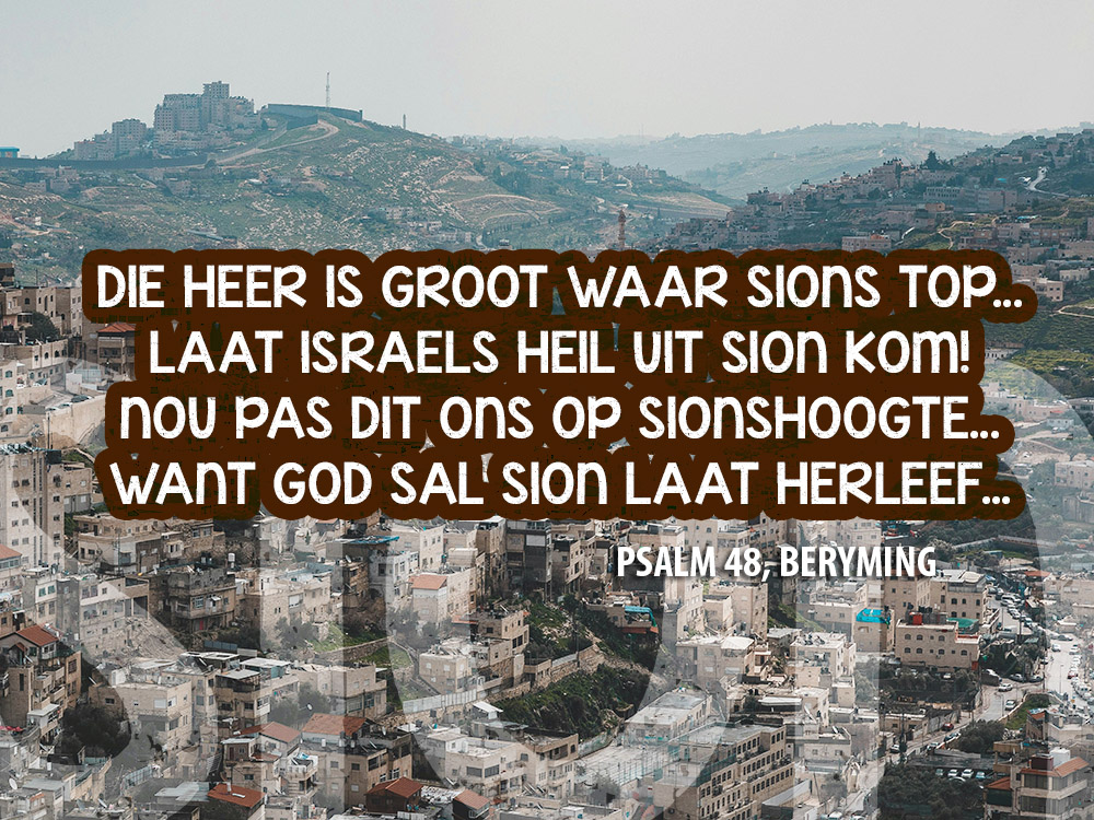 Psalm 48 is maar een van ’n paar Psalms waar ons van Sion sing. Ons kry die woord Sion meer as 150 keer in die Bybel! Wat is Sion? Dit is ’n berg in Jerusalem. Maar dis nie net enige berg nie – dit is die berg waar die Here sy tempel laat bou het. Dit is waar die Here besluit het om sy teenwoordigheid in die middel van sy volk in die Ou Testament te laat woon.