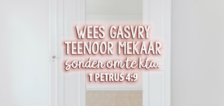 Met ons oog op Christus se wederkoms, moet ons gasvry teenoor mekaar wees. Lees hier wat presies 1 Petrus 4:9 beteken en wat dié gasvryheid behels.