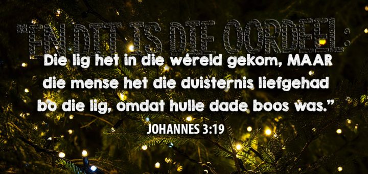 Ons lees in Johannes 3:19 dat mense die duisternis liefgehad het bo die lig. Kies jy Jesus bó die duisternis? Laat die Lig van die wêreld jou lewe verlig.